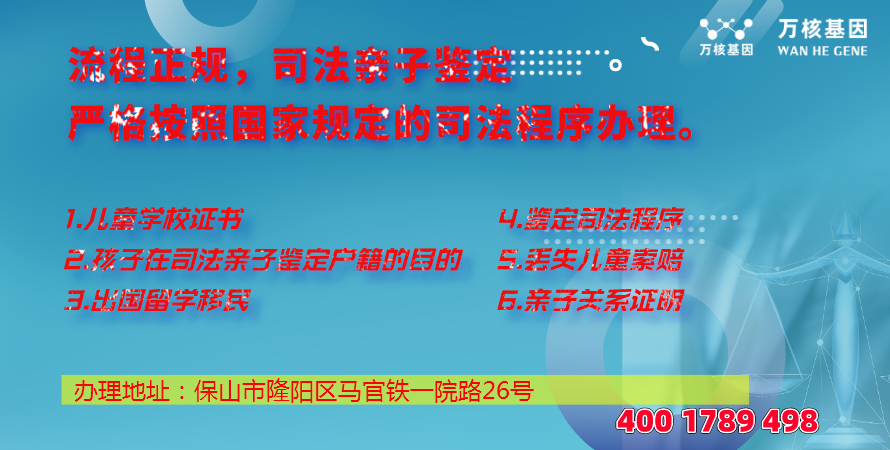 保山万核亲子鉴定服务中心是一家专门提供亲子鉴定服务机构,目前联合了多家权威法医物证司法鉴定及基因检测公司的亲子鉴定服务咨询机构。保山亲子鉴定办理地址:保山市隆阳区马官铁一院路26号,在全国各地都设有亲子鉴定分部受理点及联系方式,常年为国内外客户提供专业权威的DNA亲子鉴定服务。轻松办理亲子鉴定、个人亲子鉴定、移民亲子鉴定、上户口亲子鉴定、亲缘亲子鉴定、孕期亲子鉴定(孕5周即可检测,安全放心,保护客户隐私,覆盖全国)报告国内外通用,正规亲子鉴定机构。